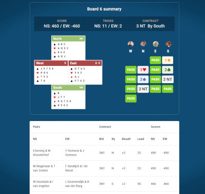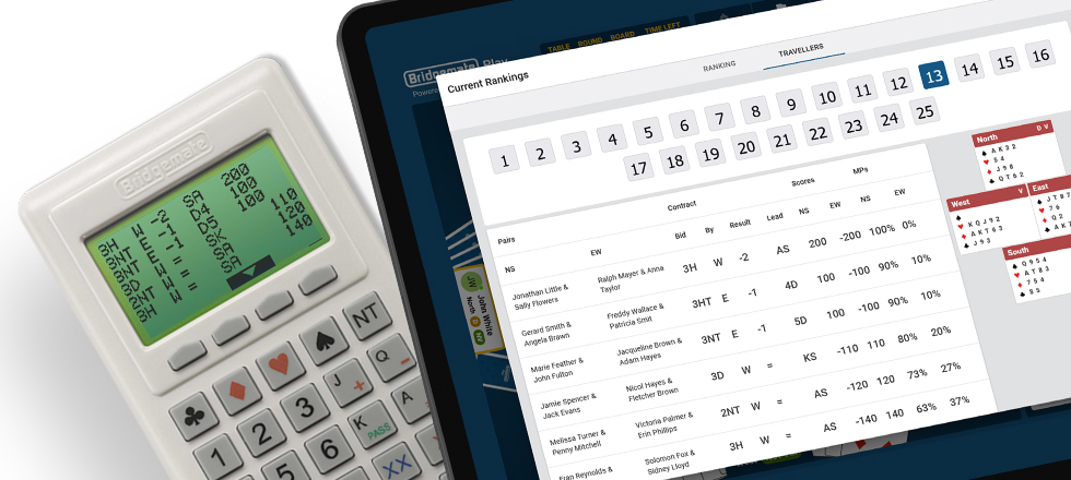 Enjoy seamless integration with your offline club game. Scores are instantly shared both online and offline. The overall rankings list, which is scored across the field, is continuously updated and contains both online and offline pairs. Online board results are displayed on the Bridgemates in the club and face-to-face board results are displayed within the online game.